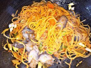 - 加入面条,翻炒均匀。
